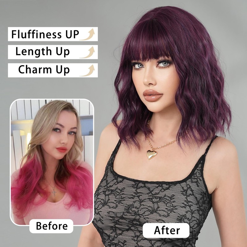 - ♛【Dark Purple Short Wavy wig】15 inch purple short bob wig with 5 inch bangs wig make people look cool.Fluffy bangs can not only be arbitrarily shaped but also perfectly hide the hairline.The dark purple wavy wig more perfectly embellishes your face,unique wavy bob wig brings more enthusiasm to you!
