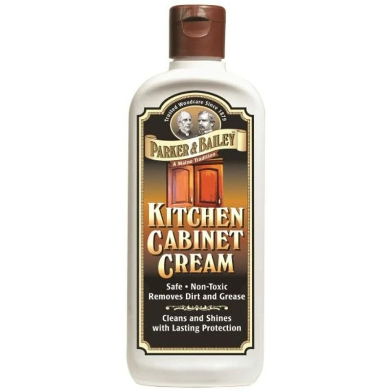 Parker Bailey Kitchen Cabinet Cream. This kitchen cabinet cream removes dirt and grease as it cleans and shines with long lasting protection. Parker & Bailey Kitchen Cabinet Cream will gently remove surface contaminants while polishing the finished wood surfaces. Kitchen cabinets require frequent cleaning and polishing due to daily exposure to airborne cooking oils, residue, fingerprints and moisture. It is non-toxic and works well to remove these contaminants safely where the family cooks and eats. This product does not use wax, silicones or harmful solvents that can build up and react with surface finishes.