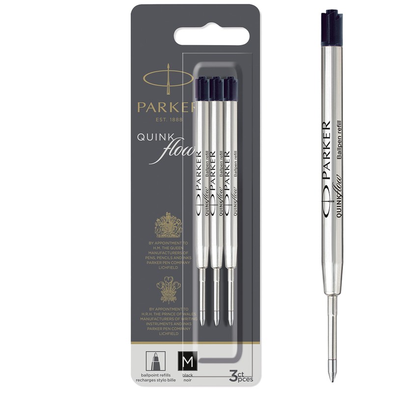Parker Ballpoint Pen Refills, Medium Tip, Black Quinkflow Ink, 3 Refills for Ballpoint Pens