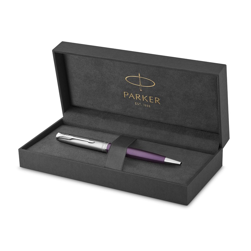 • This Parker pen features a stainless steel cap and violet lacquer barrel accented by palladium-plated trims and signature Parker arrow clip