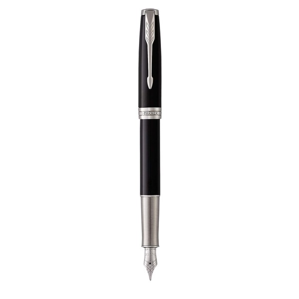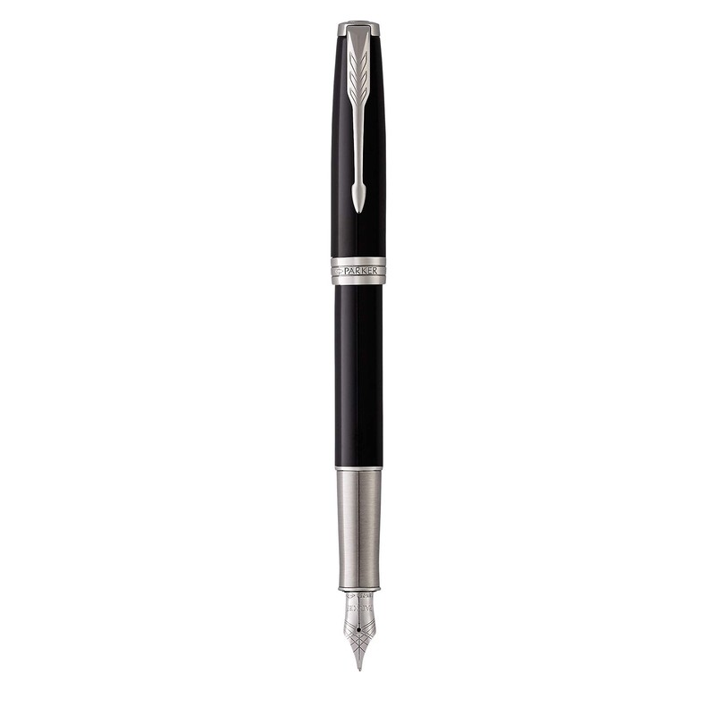 Parker Sonnet Fountain Pen | Black Lacquer with Palladium Trim | Solid 18K Gold Medium Nib | Gift Box