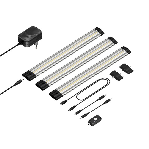 3 x Siris LC-L-037-WW under-unit light (6 x adhesive strips, 6 x screws, 6 x mounting clip), 1 x power supply - LC-SS-143, 1 x motion sensor - LC-SS-178 (2 x screws, 1 x adhesive strip), 1 x extension cable - LC-SS-162, 2 x Siris connectors. LC-SS-1 LC-S45, 2 x connection cables - LC-SS-148