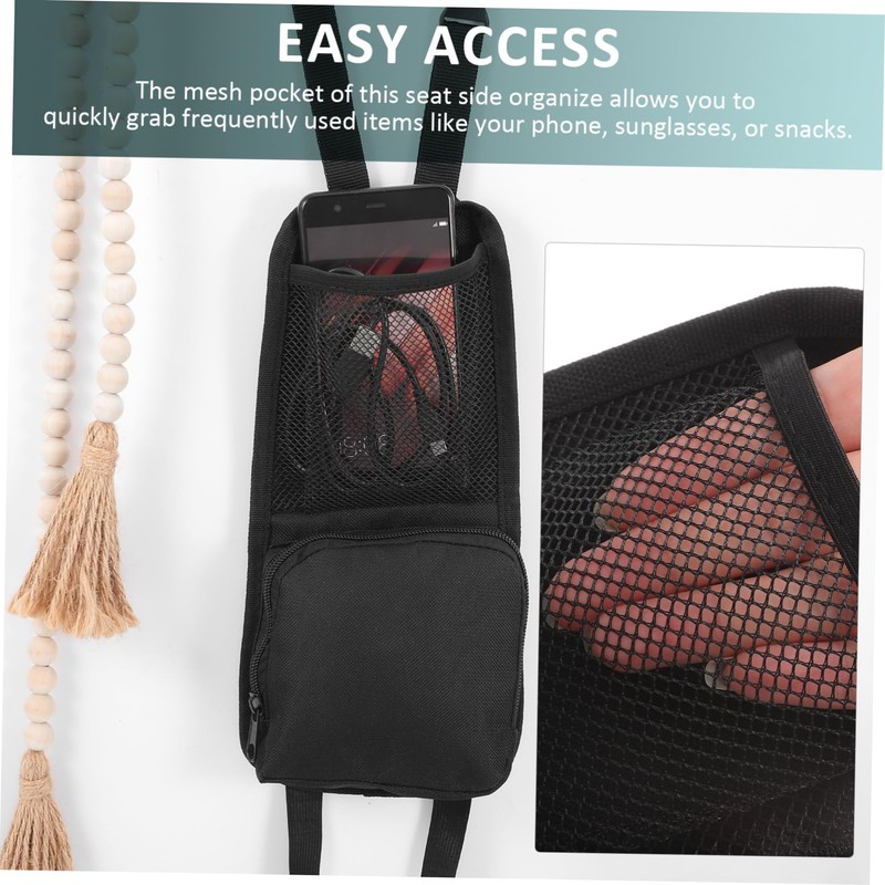 car seat mesh organizer Keep your car neat and your essentials within reach with our seat side organizer.car seat side pouch It also features an adjustable buckle for a universal fit.car side storage bag Designed with a convenient mesh pocket for easy access and a secure zipper pouch for secure storage, this organizer is ideal for storing various stuff from your phone and keys to earphones and snacks