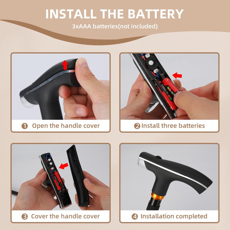 • Illuminate Your Path: The built-in LED light of this walking cane provides excellent visibility in the dark, ensuring your safety while walking.(3xAAA batteries not included)Note: Open the handle according to the arrow indicator on the handle and install the battery.
