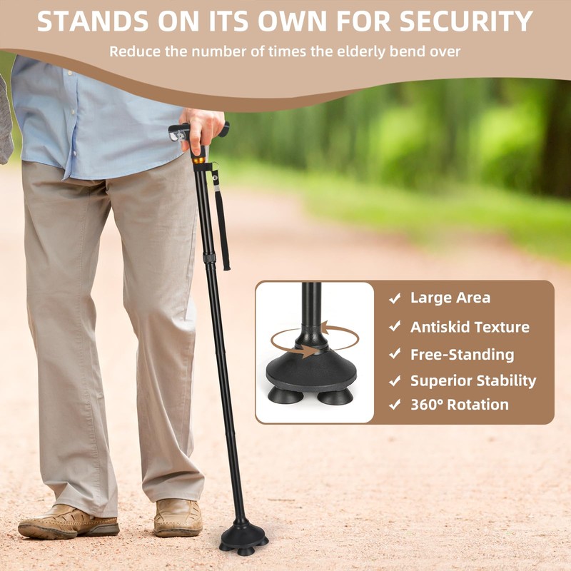 • Non-Slip Quad Base:The four-pronged base of the walking cane provides superior traction on various surfaces, minimizing slips and improving balance. Whether on smooth floors or uneven terrain, you can walk with confidence.