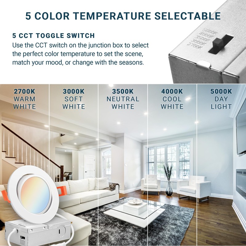 - 5 COLOR TEMPERATURE SWITCH: Set the color temperature of your lights to the desired level with a simple flip of a switch on the junction box. Choose between Warm White (2700K), Soft White (3000K), Neutral White (3500K), Cool White (4000K), and Day Light (5000K).