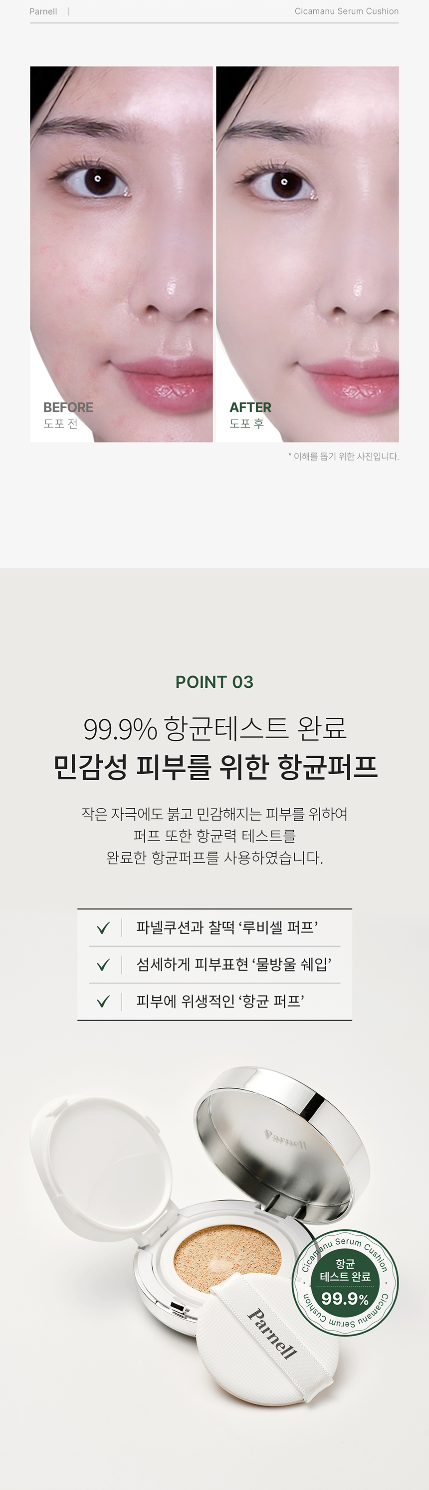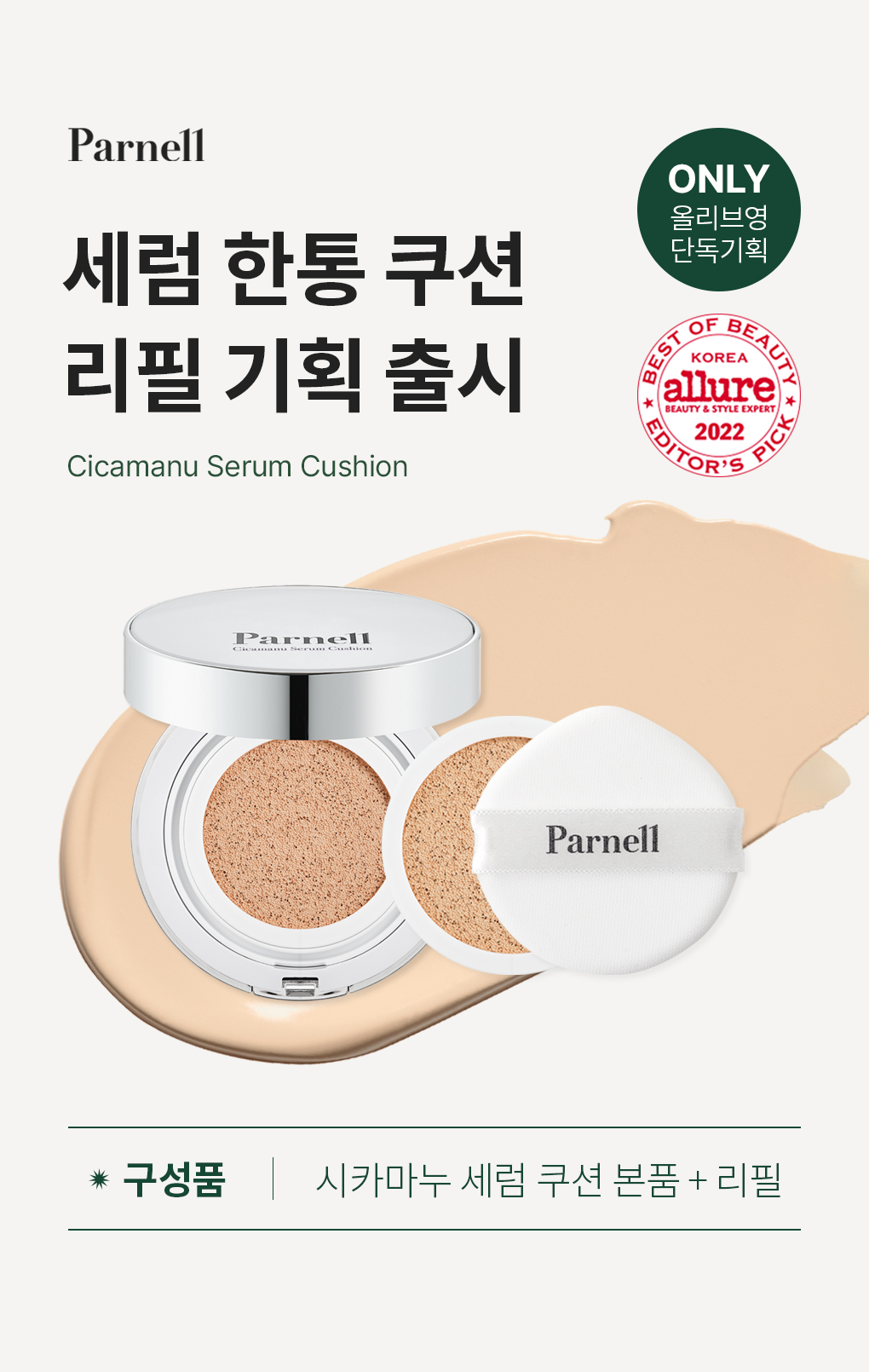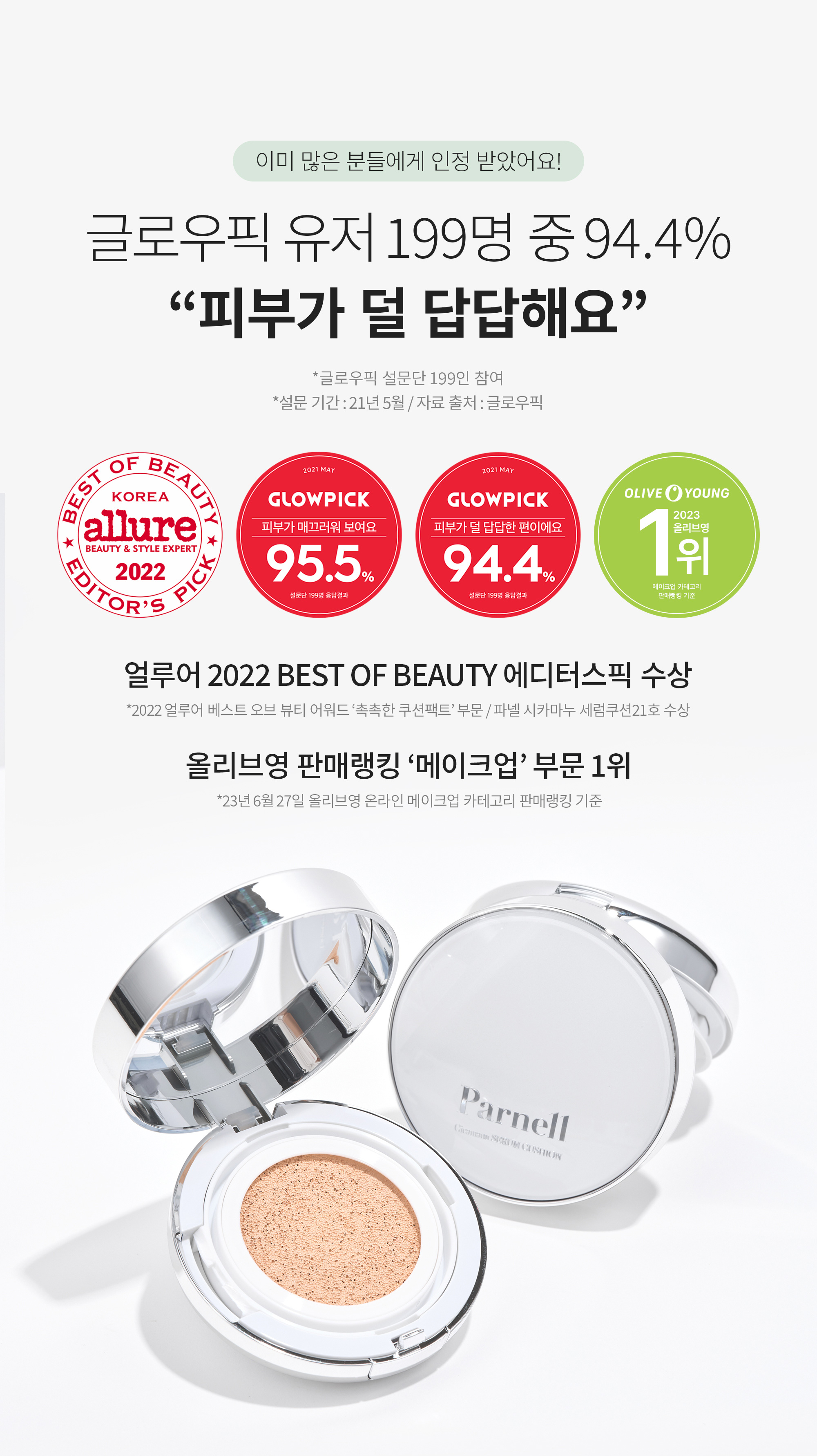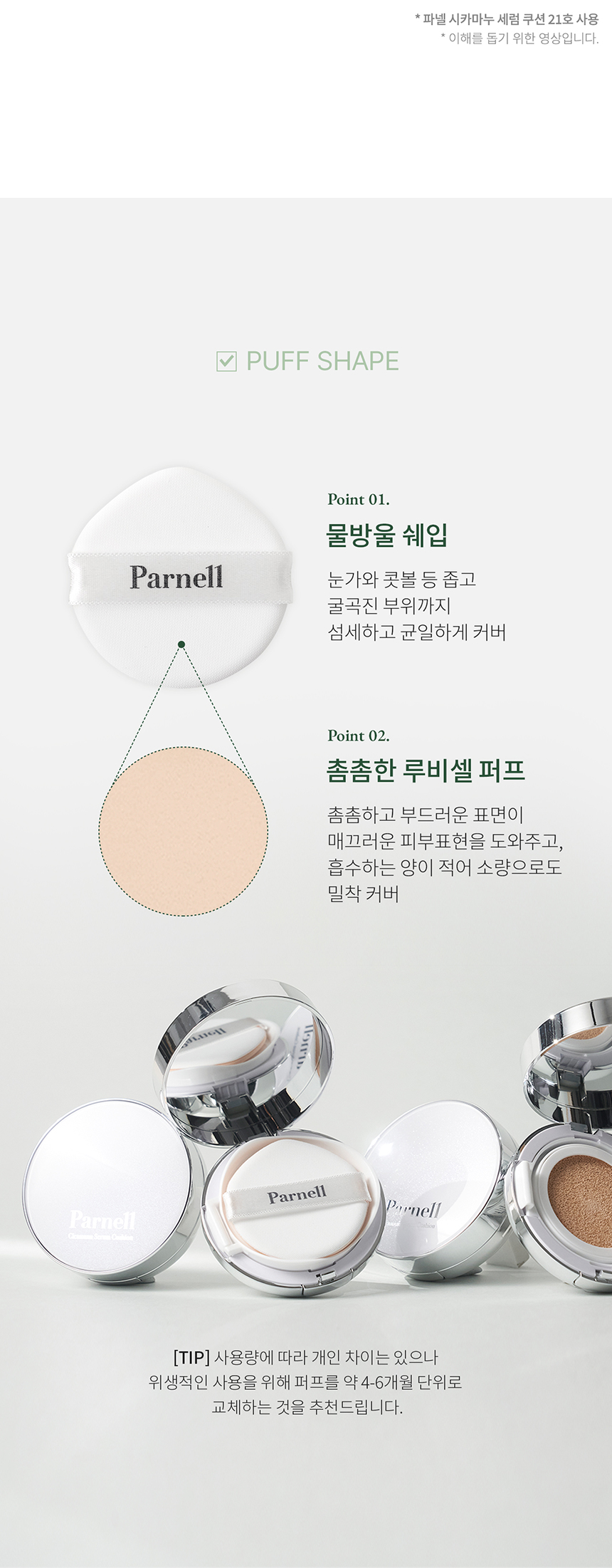 Parnell serum cushion that became the best-selling product as soon as being released. No.1 selling makeup product in Olive Young and Parnell. A product recommended by a beauty YouTuber ZZangsoon. 94.4% of 199 Glow Pick users responded that the skin is less stuffy. Won the Editor’s Pick award at Allure 2022 Best of Beauty, and no.1 selling makeup product in Olive Young. This product has a sun protection index of SPF45 PA++. The moisturizing and thin high-adhering fitting technology provides perfectly smooth skin without any lumps. Perfect coverage on sensitive and red skin. Completed clinical test regarding soothing irritated skin, and the results showed 4.2 times improved skin soothing against physical irritation, 20.89% reduction of skin redness due to physical irritation, 6.98% reduction of skin moisture loss, and 20.08% increase in skin moisture content. Completed antibacterial test with 99.9% effect regarding the antibacterial puff for sensitive skin types. Designed with rubycell puff that perfectly goes with Parnell cushion. It is an antibacterial puff sanitary on skin complete with a water drop-shape for delicate skin expression. Free from ethanol, phenoxyethanol, 7 parabens, artificial flavoring, and PEG for sensitive skin types. Completed low irritation test for sensitive skin types. A half-tone brighter skin base for brighter skin expression. A water drop-shaped puff that provides delicate and even coverage on narrow and curved areas including eye areas and nose. The dense and soft surface provides smooth skin expression, and the little absorption amount allows perfect coverage by using little amount of the product.