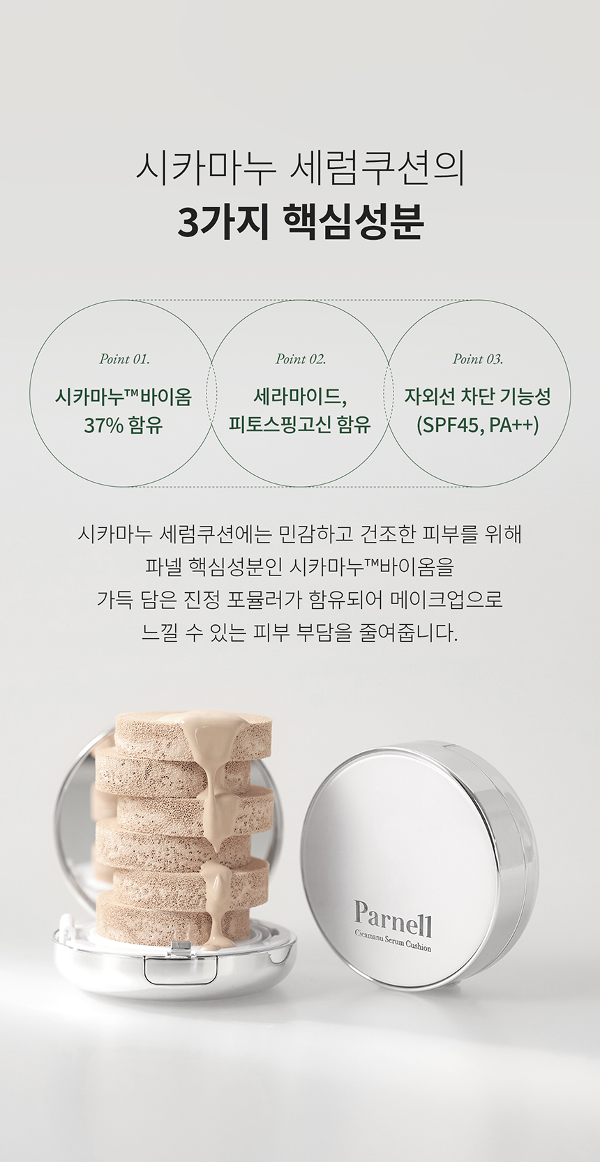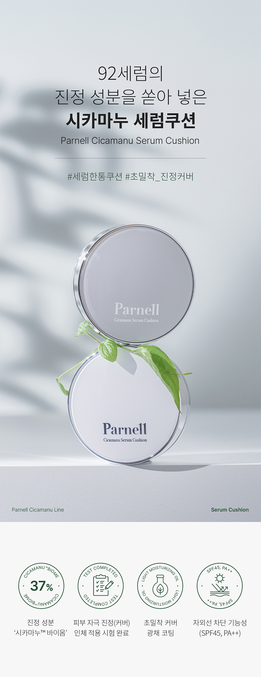 Cica manu serum cushion complete with soothing ingredients of the 92 serum. A serum cushion made with key soothing ingredients of the 92 serum for sensitive skin types. Contains CICAMANU™Biome which is key ingredient of Parnell for sensitive and dry skin types in the soothing formula to lessen skin’s burden due to makeup. Appropriate mixture of high refractive shining oil and moisturizing light oil provides skin glow while making glowing makeup through thin and perfect adherence on skin. The complex consists of high refractive light moisturizing oil technology and moisturizing ingredient provide bright and glow skin complete with delicate radiance. Parnell’s special ingredient CICAMANU™Biome consists of centella asiatica extract, New Zealand honey extract, and manuka leaf extract strengthens skin condition to make healthy skin. Contains 374,740ppm of centella asiatica extract to provide skin soothing. Contains ceramide that is effective in skin barrier care and phytosphingosine to boost the effect of ceramide to make healthy skin texture.