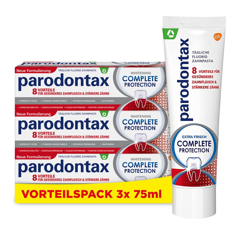 • How does Parodontax protect: The Parodontax Complete Protection Whitening toothpaste for healthy gums and strong teeth strengthens the enamel and removes discolouration. It contains fluoride to strengthen teeth and prevent tooth decay.