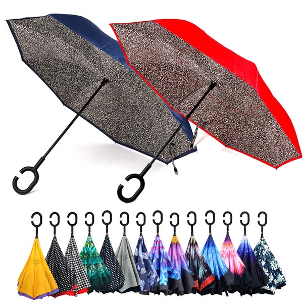 Parquet 2-Pack Double Layer Inverted Umbrellas - Leopard Navy and Red Shaped Handle Reverse Folding Windproof Umbrella for Men and Women