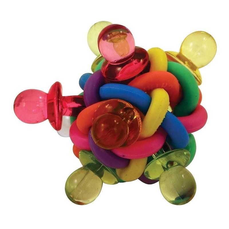 Lots of delightful pacifier beads can be found packed into the spaces left in this Binkies Ball Foot Toy for Parrots - Small.