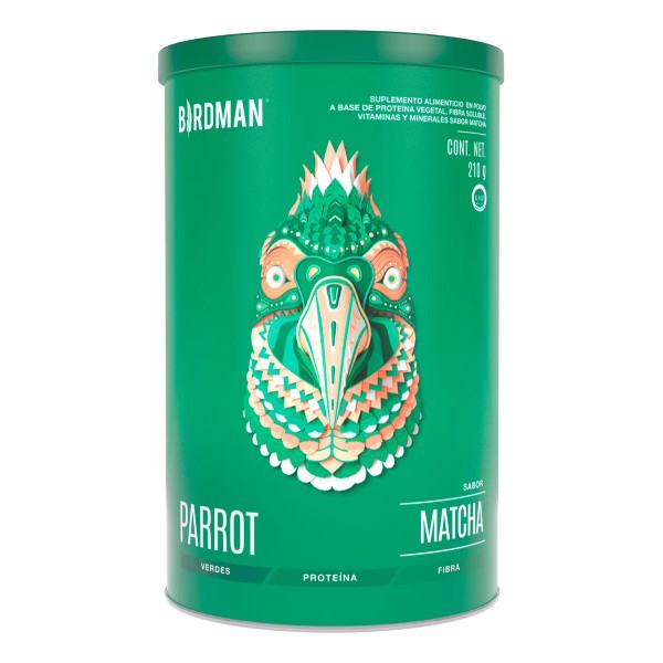 Parrot Greens Protein Birdman (210 g) es un superalimento verde en polvo con sabor a matcha que combina proteína vegana y una mezcla de vegetales ricos en nutrientes, ideal para desintoxicación, alcalinización, soporte inmunológico y un impulso natural de energía.