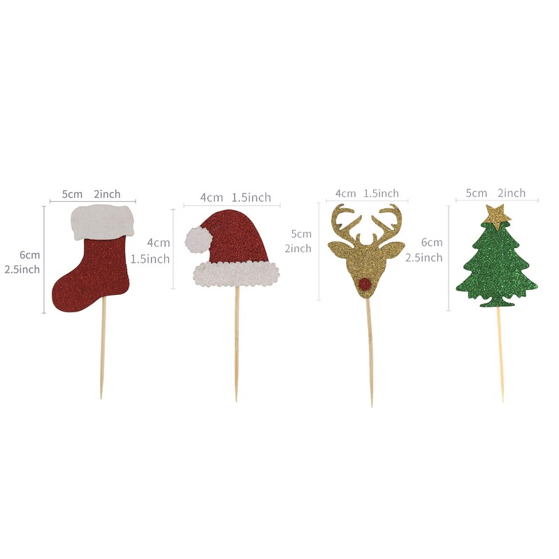 - 4 Different Design: 24 pieces cupcake topper(includes Santa Hats, Christmas Tree, Socks, Reindeer), each 6 pieces a per package