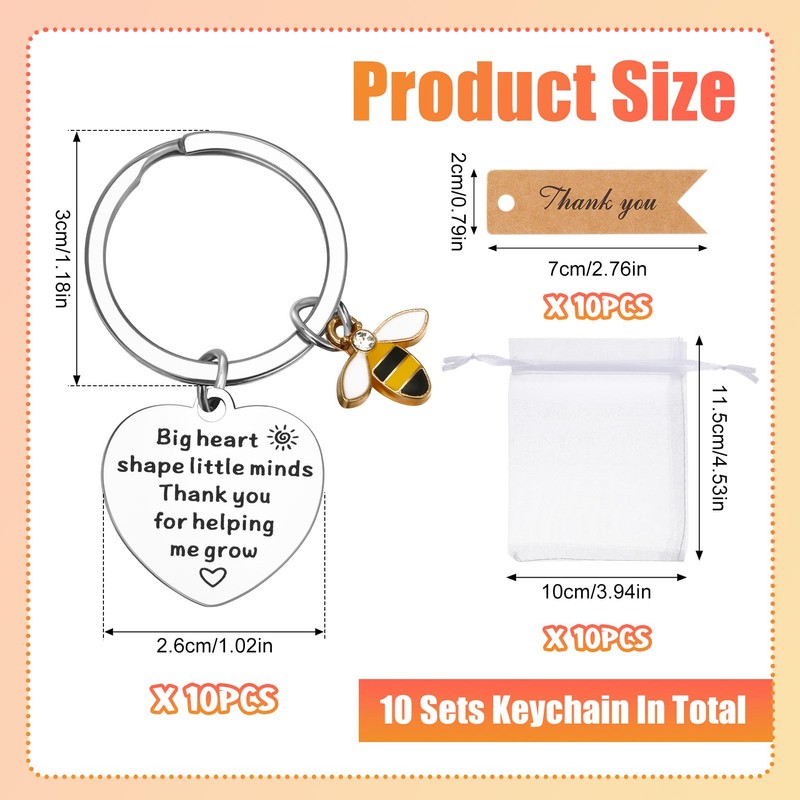 - 【Thank You Keychain Set】 You will receive 10 sets of Thank You Keychain Gifts, including 10 Stainless Steel Keychains, 10 Pcs White Organza Bags and 10 Pcs Thank You Cards. The set is complete and in sufficient quantities to meet your daily needs and as a gift for teachers. The top of the keychain reads "Big hearts shape little minds Thank you for helping me grow", which expresses your gratitude in the most sincere words