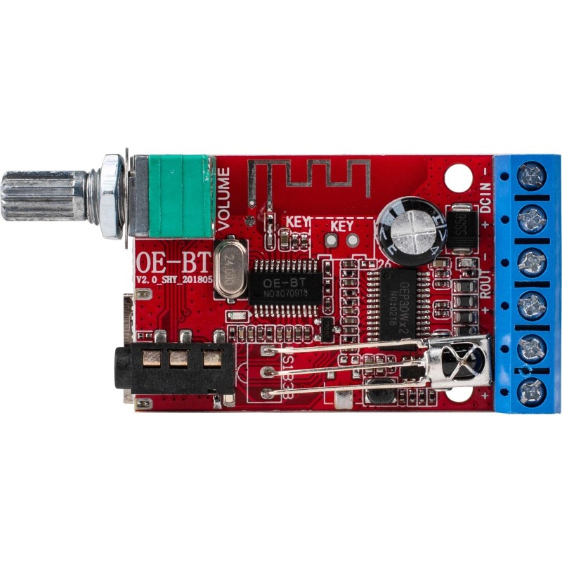 Specifications: • DC power supply range: 7.5-24 VDC with two 8 ohm speakers, 7.5 to 15 VDC with two 4 ohm speakers • Max output power: 30W x 2 @ 4 ohm • Bluetooth version: 4.2 • Bluetooth receiving range: Up to 40m • BT Name: OE-BT • SNR: 80 dB, A-weighted • Frequency response: 70-20,000 Hz (-6 dB @ 70 Hz) • Operating temperature: -40 to 185 F° (-40 to 85° C) • Dimensions: 1.97" L x 1.18" W x 0.26" H (50 x 30 x 6.5 mm) without volume control • Dimensions with volume knob: 2.84" (72 mm) long • Crosstalk: 71 dB • Max input sensitivity voltage: 75 mV • Input jack: 3.5 mm stereo • USB-A power port: 5 VDC @ 1A • USB-A port digital media: MP3 and WMA • IR input: Includes IR remote with CR2025 battery • Flash drive memory capacity: 32GB.