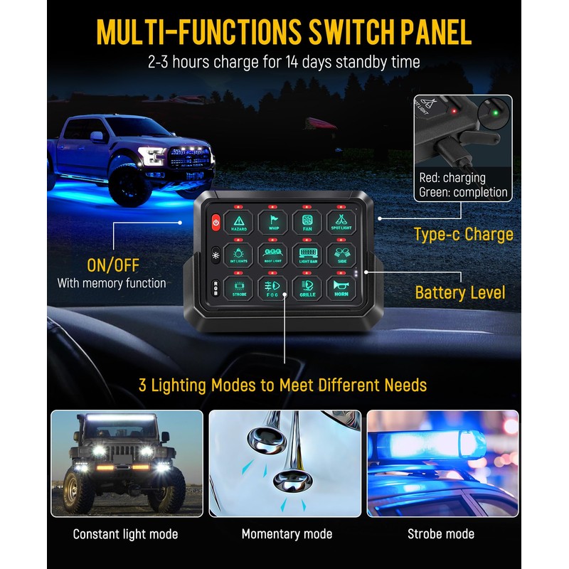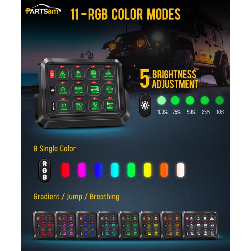 Partsam 265 Ft Wireless RGB 12 Gang Switch Panel Universal Circuit Control Relay System Box Toggle Momentary Strobe Switch Pod w/3 Silicone Button 5 Brightness Levels for Offroad Truck RV ATV UTV Boat