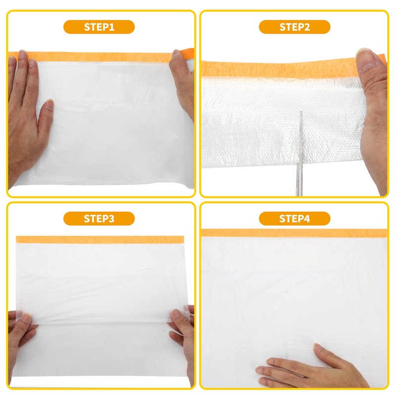 Using the shielded tape, you don' t need to worry about paint, dust splashed on the floor and walls. They can protect the asylum well, leaving no traces when moving away.Pre-taped masking film comes in different types and sizes, with different levels of adhesion and durability. They are designed to be used with water-based and oil-based paints.