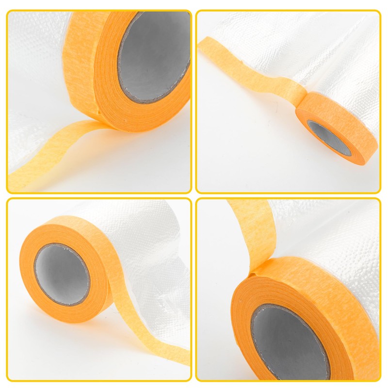 - Product Highlights: Our waterproof masking tape on the Plastic Paint Tape and Drape is made of strong adhesive washi tape, the waterproof masking tape used in this pre taped protective film can be removed cleanly and easily up to 30 days, leaving very sharp lines, without sticky residue.