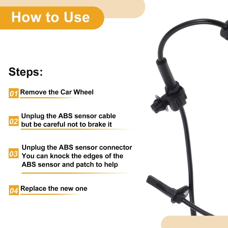 - How to use: Easy Installation.Remove the car wheel, unplug the ABS sensor and sensor connector, then replace the new abs sensor.