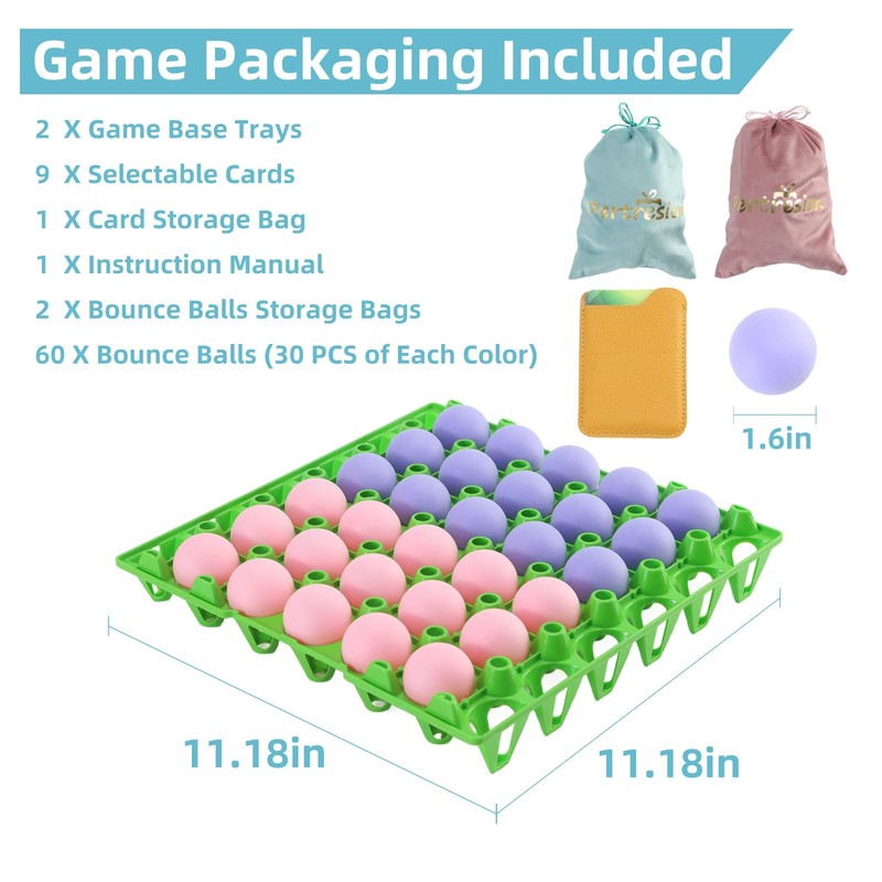- Safe Material and Package: This game toy are made of quality materials, which are safe and reliable, not easy to break or deform, lightweight and durable. The edge of each bouncing ball and base tray is smooth and won't hurt hands. This is a great interactive game for family and friends. Package included 2 X Game Base Trays, 9 X Selectable Cards, 1 X Card Storage Bag, 1 X Instruction Manual, 2 X Bounce Balls Storage Bags, 60 X Bounce Balls (30 PCS of each color). Prepare sufficient bounce balls to increase entertainment.