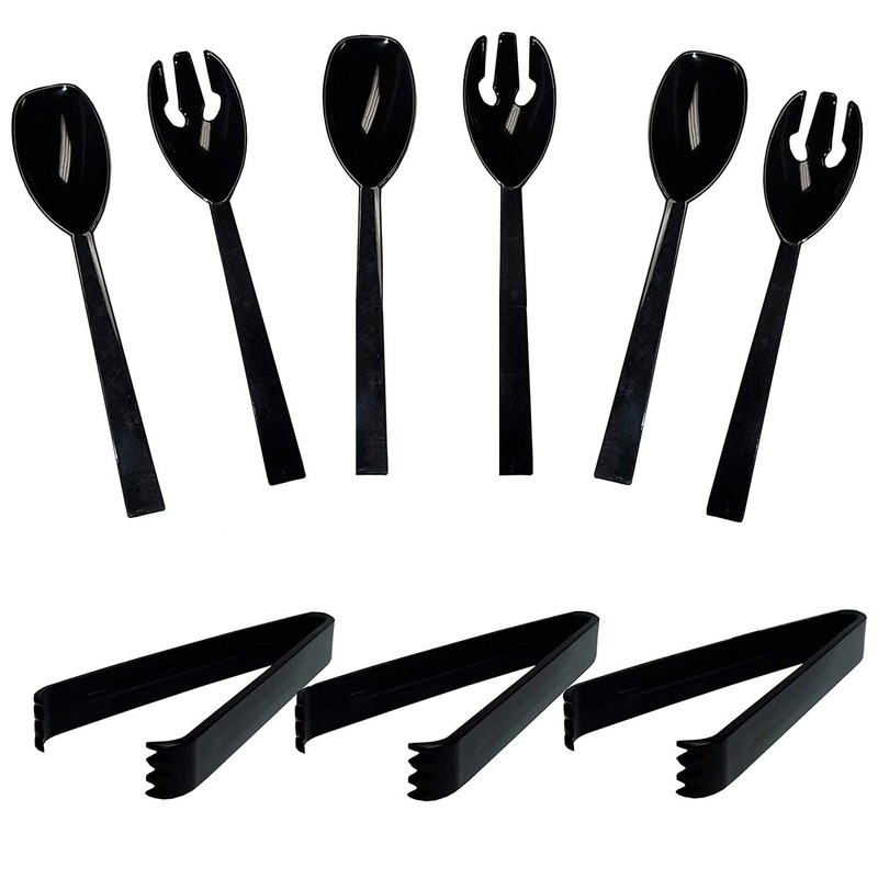 - Versatile kit includes 6 sets of hard plastic 9.5-Inch serving forks and spoons and 8 hard plastic 6.5-Inch serving tongs