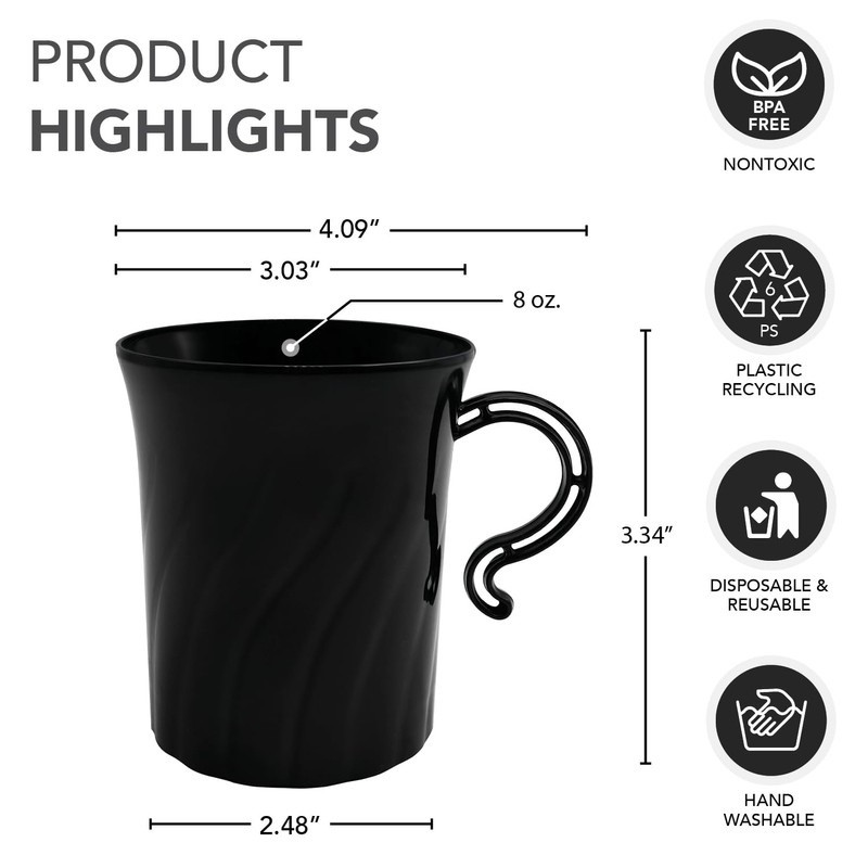 Party Essentials Disposable Plastic 8 oz. Swirled Cups With Handle for Coffee/Tea/Dessert/Fruit/Punch Drinks, Black, 20 Count