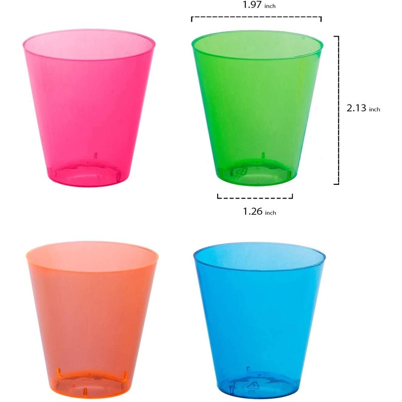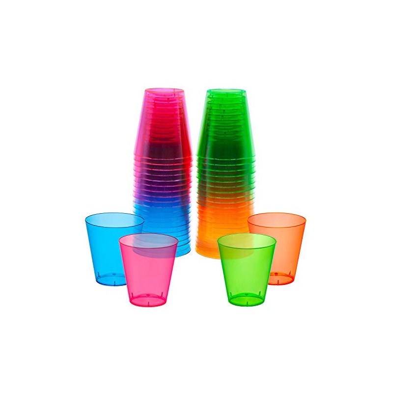 - Party essentials disposable hard plastic 2 oz. neon Brights shot glasses feature traditional barware styling and are colorful with or without backlight; blacklight reactive