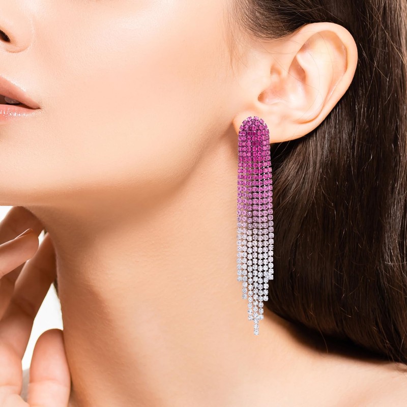 - Party Statement Earrings Pink and White Rhinestone Cluster Long Chain Tassel Dangle Glamorous
