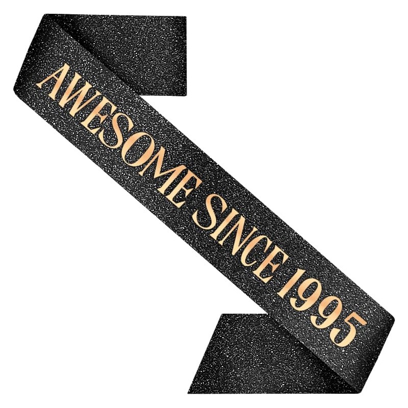 You’ve been awesome since Day 1 — now say it with style. This Awesome Since 1995 sash is made for 1995 babies who are turning 29 or celebrating their era with a little sass and a lot of sparkle. Made from black glitter fabric, rose gold foil lettering, and topped with a luxe pearl pin, this sash brings the birthday energy.