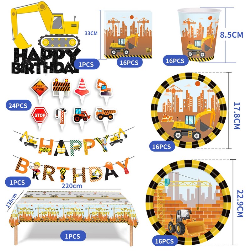 - 16 guest party tableware: 16 x excavator plates (7 inches), and 16 x excavator plates (9 inches), 16 x construction vehicle cups, 16 x party napkins, 1 x tablecloth perfect party package, 25 x cake toppers, 1 x banner for 16 guests.