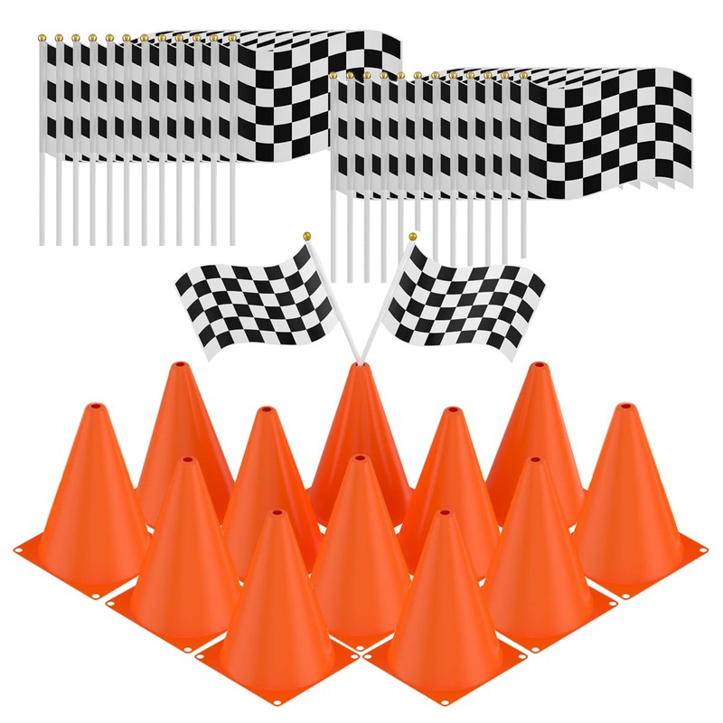 PartyTreasuresCo レースコーン パーティー&チェックフラッグパーティー用 (36個) - レースカー 誕生日パーティー用品 12トラフィックコーン 事前に穴あけ & 24レーシングフラッグ - レースカーテーマ&レーシングカーパーティーデコレーション