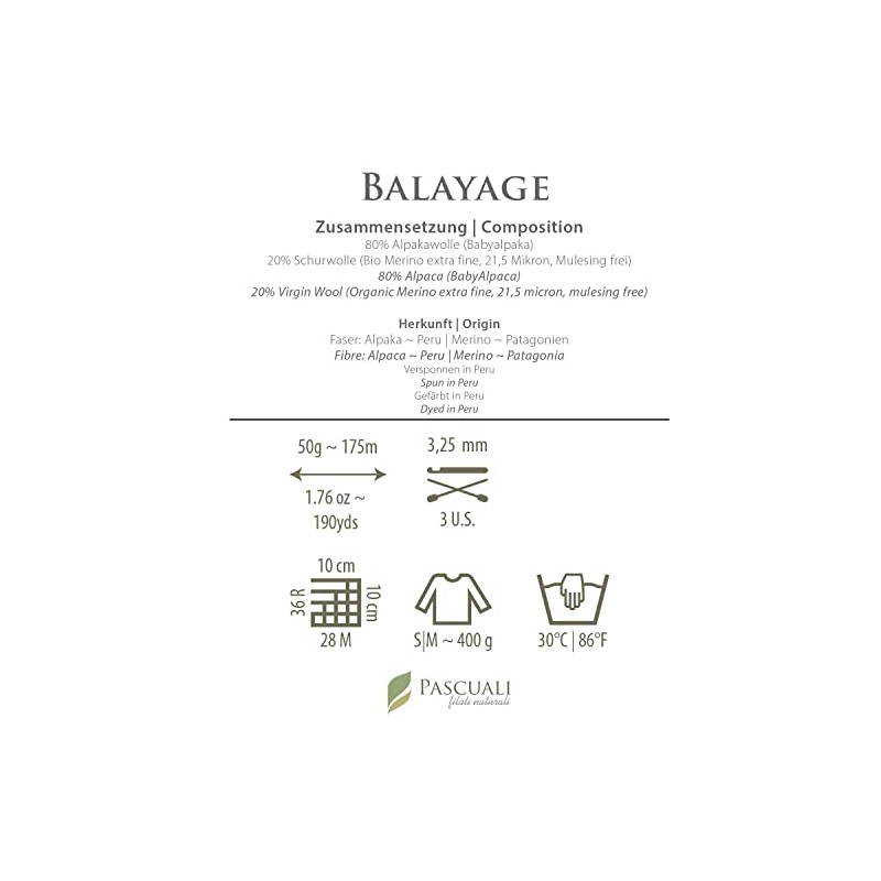 With a running length of 175m per 50g, Balayage is ideal for knitting projects such as shawls, sweaters or accessories and is particularly suitable for multi-coloured techniques such as jacquard or fair isle.