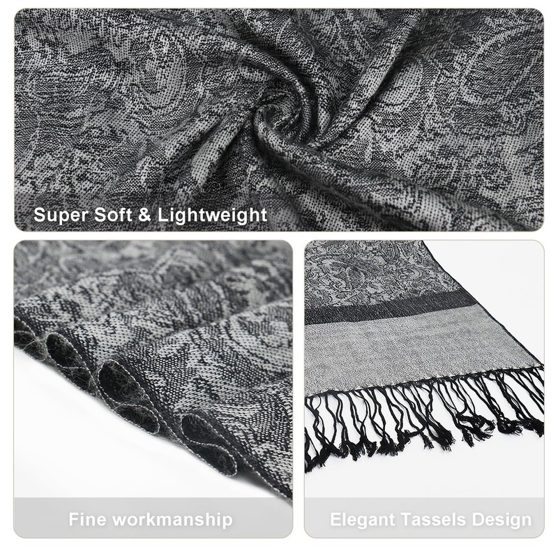 - 💝Super Soft & Silky:Our pashmina shawl is made of great quility Viscose Acrylic blended fabric,which super super soft comfortable silky cashmere feel drape nicely.And our paisley pattern is crafted with full jacquard Double-side design, which makes the scarf look more upscale and textured,and you can wear whichever side you want.