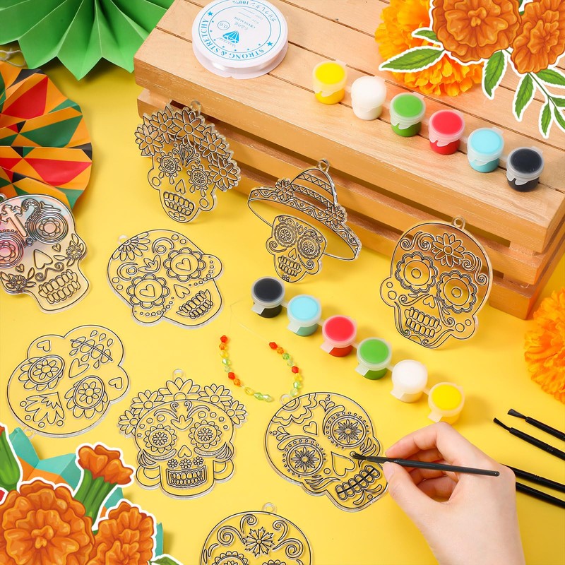 - Day of the Dead Suncatcher Craft Kits: package includes 36 day of the dead suncatchers in 9 designs, 36 paintbrushes, 36 suction hooks, 18 colored paints pots, 1 roll of fishing thread, and about 432 colorful acrylic beads; Use the paintbrush to add colors to Dia De Los Muertos suncatchers, then hang them with the suction hooks in the window to catch sunlight