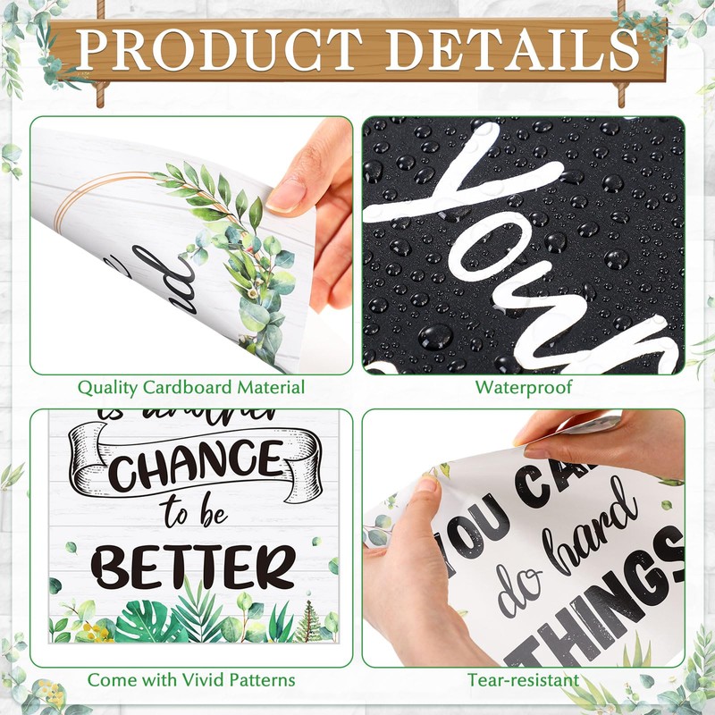 • Motivational Eucalyptus Theme Design: our eucalyptus posters for classroom are designed with bright fresh green, white and black colors and inspirational words, such as [Your Attitude Determines Your Direction][Be Kind], which can help students promote positive growth mindset and create a welcoming classroom atmosphere