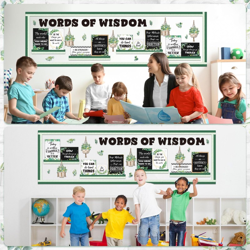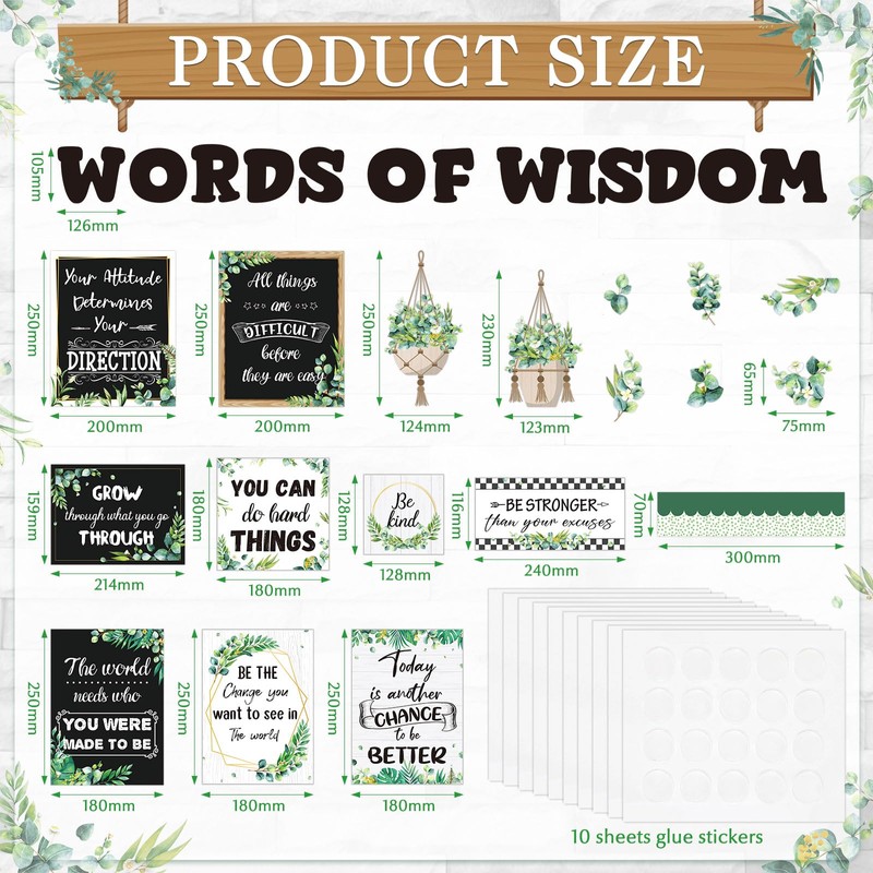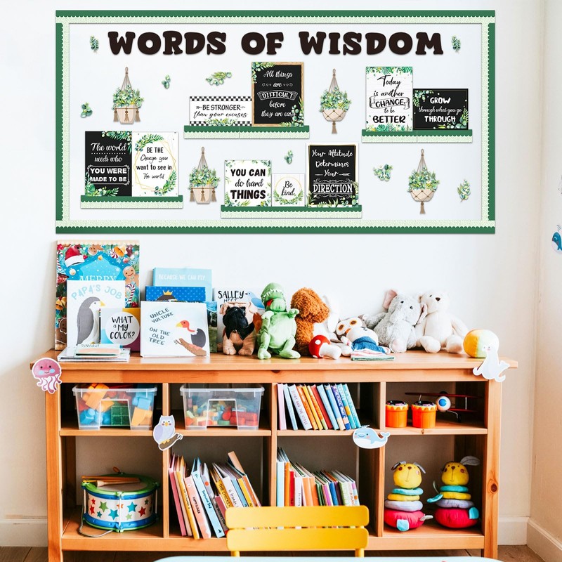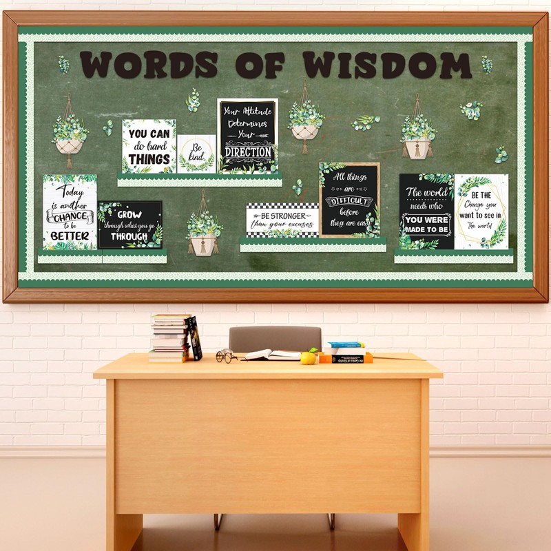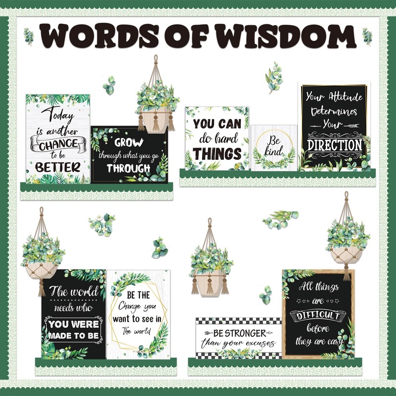 • What You Will Get: package includes 46 pcs Eucalyptus Bookshelf Bulletin Board Decor including inspirational cutouts, green plant pots cutouts, leaf cutouts, green retro wood grain borders, coming with adhesive dots; These Plant Inspirational Classroom Decor feature fresh colors and vivid patterns, which can add nature and positive atmosphere to your classroom