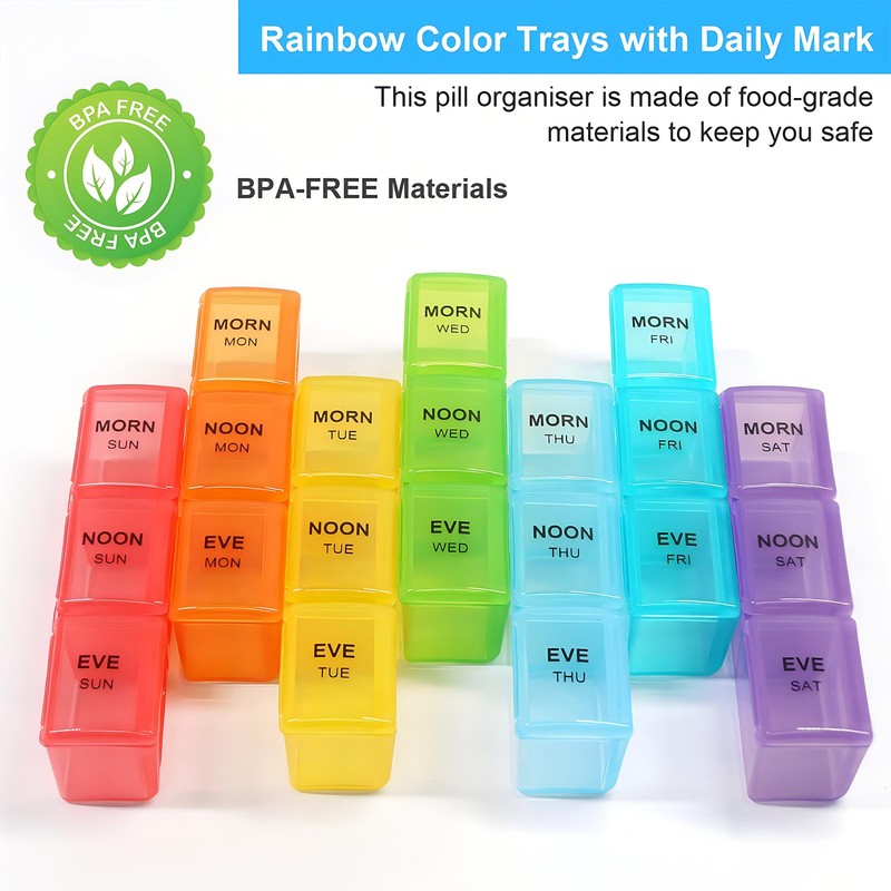 - Make Health Management Simple: Not to mix tablets from different bottle together every time any more. We have the perfect weekly pill organiser with daily compartments that are divided into morning, afternoon and evening, only one time you could place all your dosette of one week in their corresponding compartment, rainbow colours help you make medication and health management easy, so brilliant planner