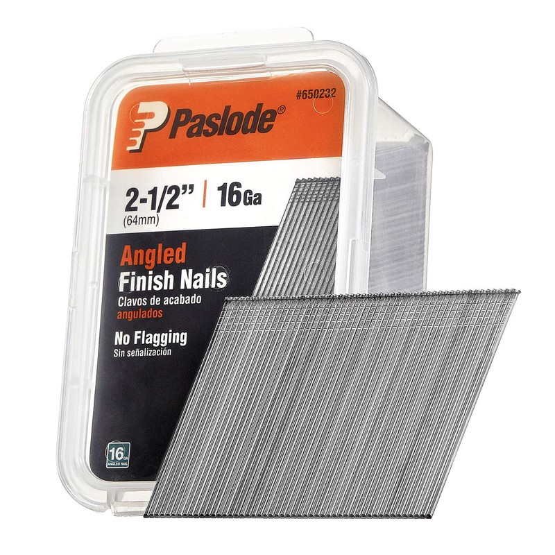 Paslode 2-1/2" 16 Gauge Angled Finish Nail is for use with Paslode's Cordless (#900600) or Pneumatic (T250A - #500910) 16g Angled Finish Nailers. The high quality Paslode 2-1/2" 16 gauge angled nail ensures consistent drivability. Uses include: door/window trim, paneling, baseboard, crown molding, door jams, cap & shoe molding and much more. 2000 ct