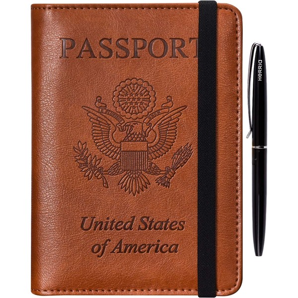 Passport Holder Cover Wallet - Rfid Blocking Leather Travel Accessories Card Case Document Organizer with Pen for Women Men(Brown)