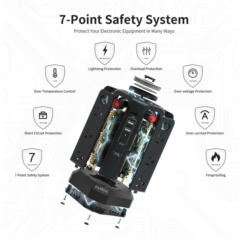 - Smart Power Strip with Night Light: PASSUS power strip tower with night light mode features three brightness levels. The soft and comfortable light is just enough to light the surrounding area, enhancing safety at night. You can manually turn on/off the night light to meet your needs.