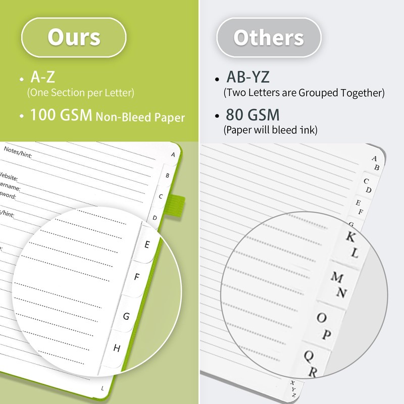 - Alphabetical Tabs (A-Z): We upgraded to one letter one tab(A-Z),others are two letters share 5 pages(AB-YZ). Our password journal has 6 pages per alphabetical tab. Makes your password easy to find and keeps organized.