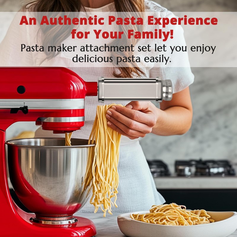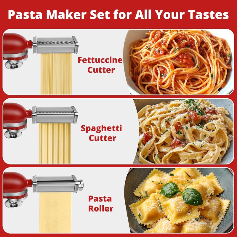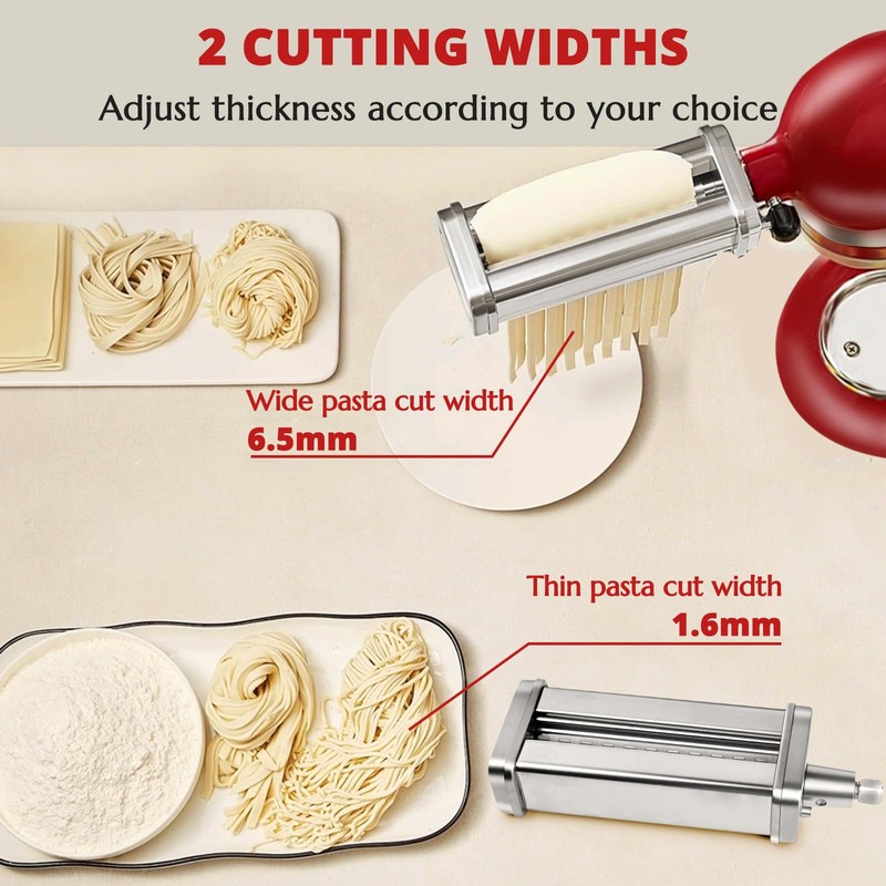 - PERFECTLY FOR KITCHENAID STAND MIXERS: This kitchen aid accessories and attachments are compatible with all KitchenAid stand mixers, and it is easy to make spaghetti with only one connection. A set include roll, thin cut, and wide cut pasta, and you can taste delicious pasta faster without buying other accessories.