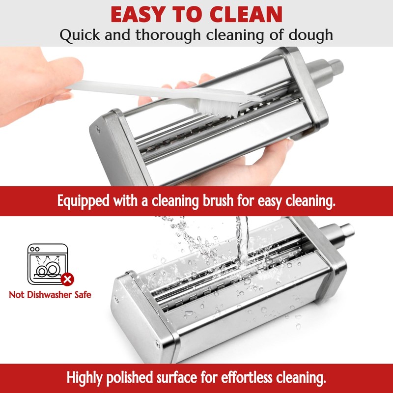 - EASY TO USE AND CLEAN: Kitchenaid pasta attachment ensures simple operation. Install it on your KitchenAid Stand Mixer, turn it on and throw yourself into the world of making spaghetti quickly. The detachable fuselage allows for thorough cleaning of detailed corners. The brush in the package can be used to clean the residual flour on the machine. DO NOT wash the attachment in the dishwasher.