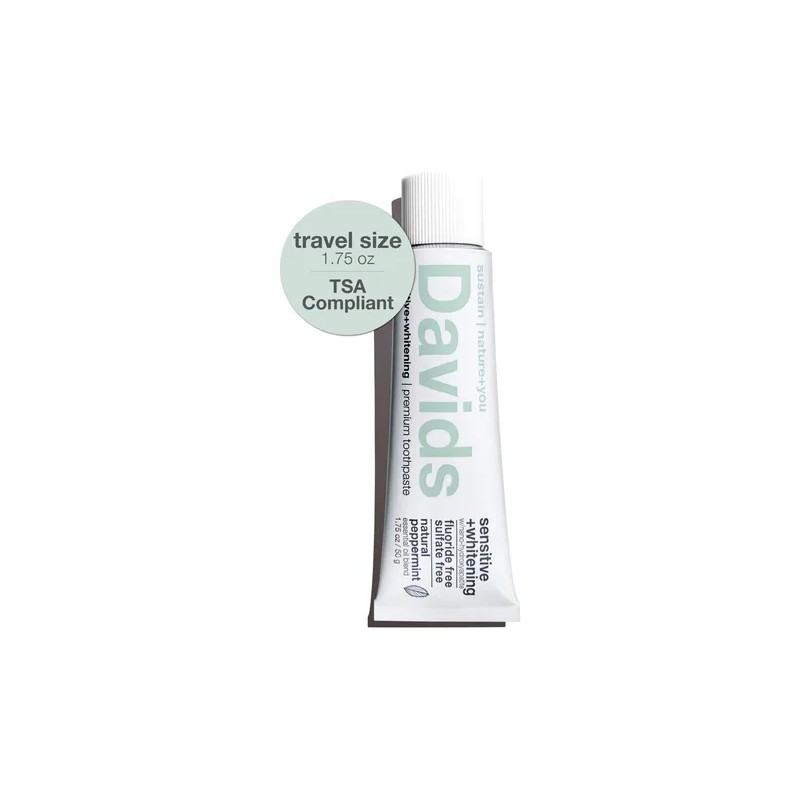 Davids Sensitive+Whitening es una pasta dental natural de nanohidroxiapatita (n-ha) de primera calidad, fabricada en California, con un enfoque en la sostenibilidad. Davids utiliza ingredientes de origen natural y de origen natural para reducir la sensibilidad, blanquear los dientes, reducir la placa y refrescar el aliento de forma segura y eficaz. La nanohidroxiapatita (n-HA) se usa para reducir la sensibilidad al obstruir los conductos (túbulos) que van a los nervios de los dientes. Los abrasivos de origen natural ayudan a la acción del cepillado y ayudan a eliminar las manchas superficiales, lo que hace que los dientes sean más blancos y una boca limpia y saludable. El bicarbonato de sodio se usa para neutralizar los ácidos y promover una buena higiene bucal. El aceite de menta de primera calidad de varias regiones productoras de menta de EE. UU. se mezcla para crear un increíble sabor a menta y refrescar el aliento. Davids recibió la certificación EWG VERIFIED del grupo de trabajo medioambiental por sus ingredientes limpios y seguros. ¡Davids hizo todo lo posible por utilizar un 98% de ingredientes de origen estadounidense para producir una pasta de dientes de la más alta calidad posible y para apoyar los puestos de trabajo en EE. UU.! ¡Descubra por qué tanta gente se está cambiando a Davids! Descargo de responsabilidad: la certificación EWG VERIFIED fue reemitida para la pasta de dientes Davids en 2020 por el Environmental Working Group (EWG), una organización externa sin fines de lucro que califica la seguridad de los ingredientes basándose en sus informes y hallazgos científicos independientes. Visite la base de datos EWG Skin Deep para obtener más información. Incluye Hydroxi, nuestra formulación patentada de nanohidroxiapatita (n-HA), el mismo ingrediente que constituye de forma natural el 97% del material de sus dientes, e ingredientes naturales cuidadosamente seleccionados. Eliminamos el flúor y lo sustituimos por este ingrediente biocompatible para remineralizar el esmalte, reducir la sensibilidad dental y blanquearlo de forma natural. - Los micropulidores blanqueadores Safe & Gentle eliminan suavemente las manchas superficiales para blanquear de forma segura sin causar la sensibilidad que normalmente se encuentra con el peróxido u otros agentes blanqueadores. La RDA (índice de abrasión) es de 101 para eliminar eficazmente la placa y las manchas superficiales y, al mismo tiempo, proteger el esmalte para el cepillado diario. Rango seguro según la ADA (Asociación Dental Estadounidense). - Bioactive Sensitive Relief: la mayoría de las pastas dentales sensibles utilizan nitrato de potasio (un medicamento que adormece los nervios) para adormecer temporalmente los nervios de los dientes. Usamos hidroxiapatita (n-HA) para reducir la sensibilidad al remineralizar el esmalte y los conductos (túbulos) que van a los nervios. - Ingredientes limpios y seguros Davids utiliza solo ingredientes de primera calidad derivados de plantas y la tierra, sin subproductos animales (veganos). Sin flúor, sin sulfatos (sin SLS), verificado por el EWG. Sin sabores, colorantes ni conservantes artificiales. El xilitol de abedul se usa para mejorar la salud bucal. - Tamaño práctico: la pasta de dientes sin flúor de Davids viene en tubos de 1.75 oz que cumplen con los requisitos de la TSA, perfectos para sus necesidades de cuidado bucal mientras viaja