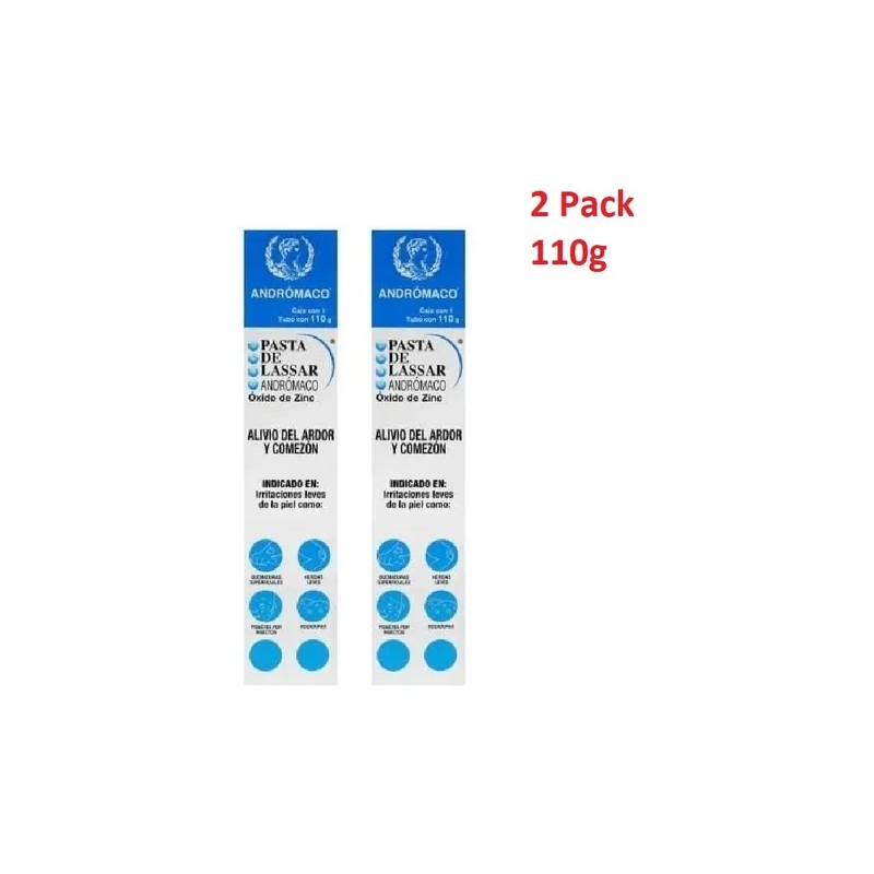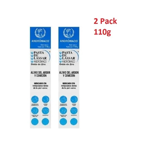 Descripción Limpia: Pasta de Lassar Andromaco en dos tubos de 110 grs cada uno. Pomada diseñada para combatir rozaduras leves a moderadas de la piel, creando una barrera protectora que contribuye a una recuperación más rápida de la piel afectada. Alivia picaduras de mosquitos y es eficaz en la protección contra la irritación de la piel del bebé. También es adecuada para proteger la piel de adultos mayores de irritaciones causadas por el uso de pañales debido a incontinencia urinaria, ayudando a disminuir el ardor y la comezón.