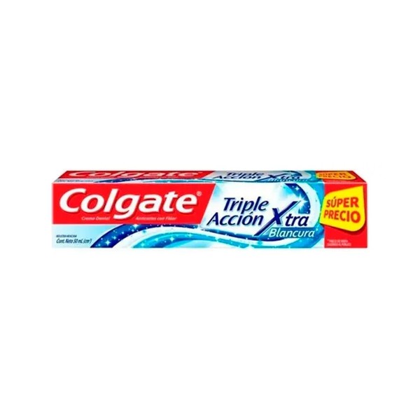 Descripción Limpia: Despierta cada mañana con una sonrisa radiante gracias a la Pasta Dental Colgate Triple Acción Extra Blancura. Este tubo de 50 ml es tu aliado perfecto para mantener una higiene bucal óptima y disfrutar de una sensación de frescura duradera. Su fórmula avanzada está diseñada para ofrecerte ese extra de blancura que buscas, eliminando manchas y previniendo la formación de nuevas.