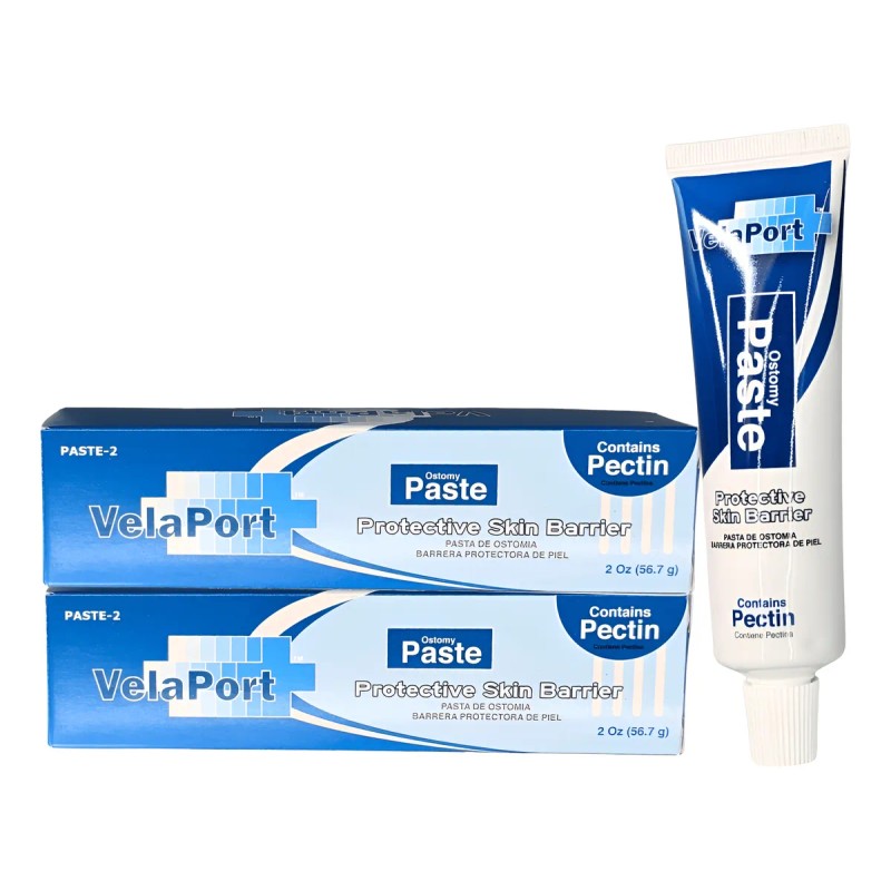 Este paquete de tres pastas para ostomía Velaport Ostomy es una barrera cutánea protectora diseñada para el cuidado de los estomas. Cada tubo contiene 56.7 gramos de una pasta hidrocoloide de alta calidad, formulada para rellenar, nivelar y sellar las irregularidades de la piel alrededor del estoma. Esto incluye pliegues, cicatrices y otras depresiones que pueden dificultar un sellado adecuado.