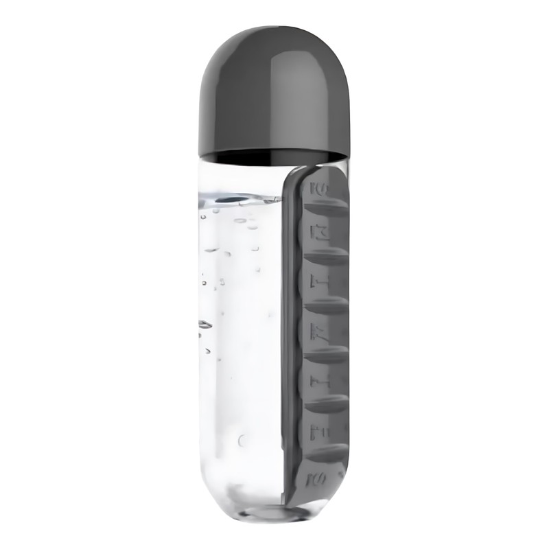 - Diseño 2 en 1: Pastillero + Botella de Agua Incorpora un organizador semanal con compartimentos individuales para cada día de la semana y una botella de agua de capacidad ideal para facilitar la toma de medicamentos en cualquier momento.