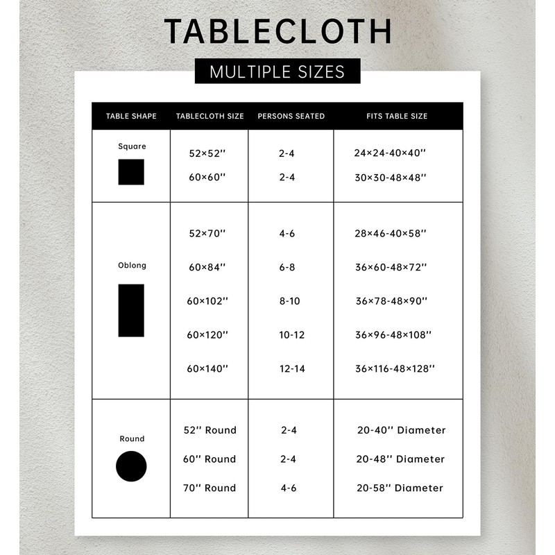 Cómo elegir el mantel de tamaño adecuado - Para mesa de comedor: longitud del mantel = longitud de la mesa + 16 ~ 24 pulgadas, ancho del mantel = ancho de la mesa + 16 ~ 24 pulgadas, cada extremo cae aproximadamente 8 ~ 12 pulgadas.