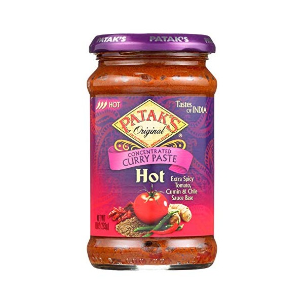 Pataks concentrated curry paste hot is a thick paste of ground spices preserved in oil especially made to be used as a base for delicious authentic tasting hot and spicy curry. This formula is all vegetarian and gluten-free. It doesn't contain any artificial colors or flavors. Each jar contains 10 oz. Of concentrated curry paste.country of origin : united statesis gluten free : yessize : 10 ozpack of : 6selling unit : caseingredients : water;canola oil;coriander;cumin;concentrated tomato purÃe;salt;corn flour;turmeric;color;chile pepper;acetic acid;spices;sugar;ground ginger;tamarind;paprika;garlic powder;citric acid;lactic acidkeywords : base;gluten;spicy;turmeric;vegetarian